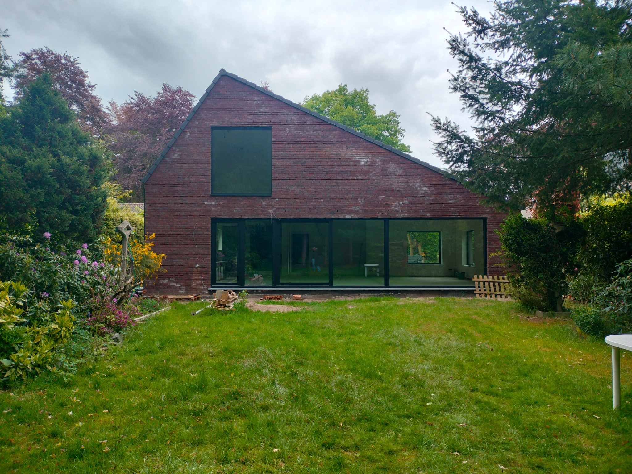 De inkomhal aan de zijkant bleef behouden. Vanuit de wens om openheid te creëren, hebben we meerdere binnenwanden verwijderd. Hierdoor ontstaat een ruime zithoek die naadloos overgaat in een leefkeuken. De garage en berging werden verplaatst naar de voorkant van de woning voor een praktischer gebruik; dit deel van de woning maakt geen deel uit van het beschermd volume. Aan de straatzijde krijgt de woning een meer gesloten karakter, terwijl de achtergevel juist open en transparant is dankzij een grote raampartij die de leefruimte verbindt met de tuin. Een deel van de garage wordt afgewerkt met houten gevelbekleding, terwijl de rest van de woning een warme, donkerrode baksteen krijgt.